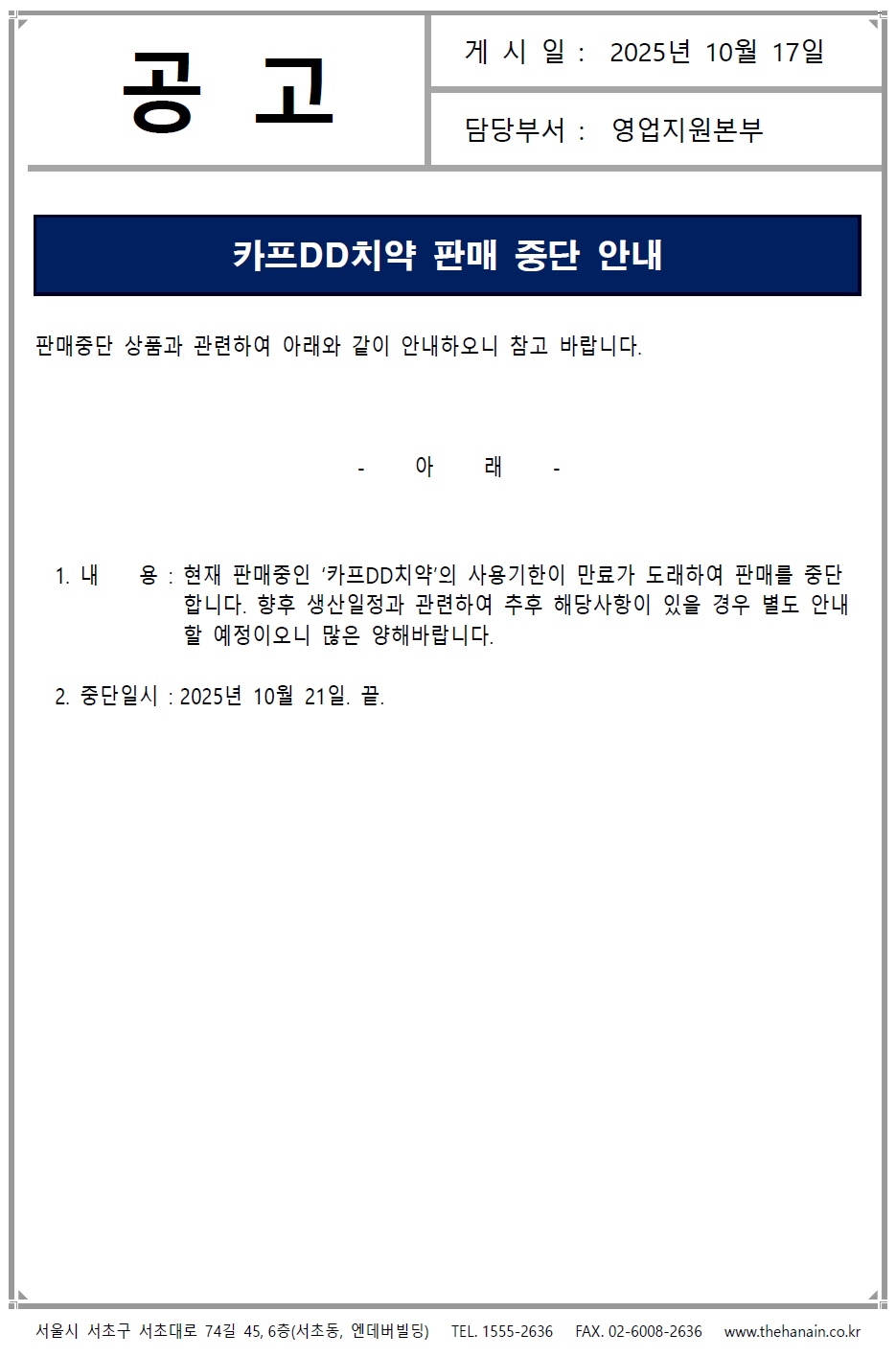 '카프DD치약' 판매 중단 안내