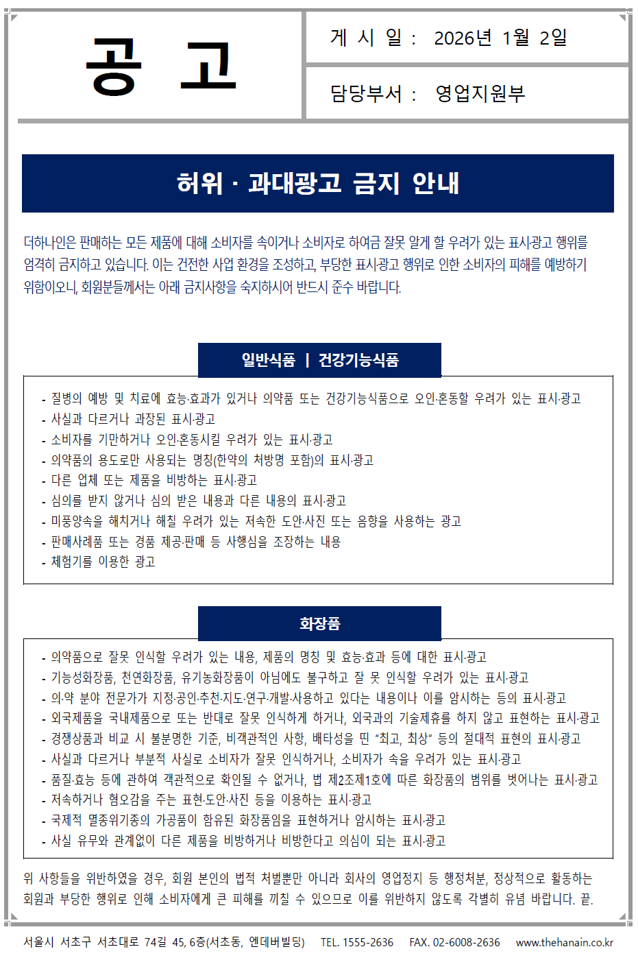 안녕하세요, 더하나인입니다. 건전한 사업 환경을 조성하고, 부당한 표시·광고 행위로 인한 소비자의 피해를 예방하기 위해 아래와 같이 허위·과대광고를 엄격히 금지함을 안내하오니 회원분들께서는 숙지하시고 준수 바랍니다. 감사합니다.
